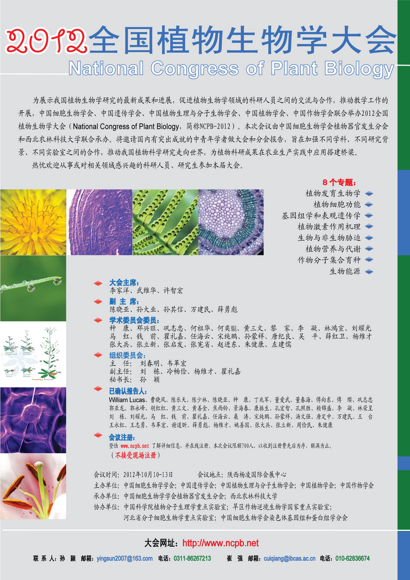 為展示我國植物生物學研究的最新成果和進展,促進我國植物生物學各相關研究領域的科研人員之間的交流與合作,推動教學工作的開展,中國細胞生物學會、中國遺傳學會、中國植物生理學會、中國植物學會和中國作物學會將于2012年10月10-13日聯合舉辦“2012全國植物生物學大會”。 大會將邀請相關領域專家學者做學術報告,研討和交流植物分子生物學和現代農業(yè)研究的最新成果。熱誠歡迎并邀請國內外同行參加研討會。會議詳情請登陸大會網址:www.ncpb.net。
