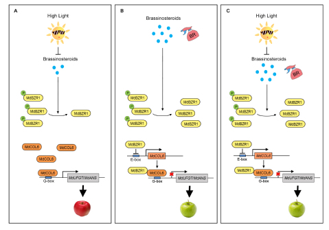 該研究建立了以MdBZR1–MdCOL6復(fù)合體為核心的分子調(diào)控模型(圖2),通過整合BR和光信號(hào)以調(diào)節(jié)蘋果中花青苷的生物合成。闡明了花青苷生物合成調(diào)控過程中光和BR信號(hào)整合的分子基礎(chǔ),為蘋果果實(shí)營(yíng)養(yǎng)品質(zhì)的遺傳改良提供理論依據(jù)。