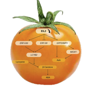 ETHYLENE-INSENSITIVE 3/ETHYLENE-INSENSITIVE 3-LIKEs (EIN3/EILs)是果實成熟過程中乙烯響應的重要因子。該研究發現EIL2控制番茄(Solanum lycopersicum)的類胡蘿卜素代謝和抗壞血酸(AsA)的生物合成。與野生型(WT)授粉45天后呈現的紅色果實相比,CRISPR/Cas9 eil2突變體和SlEIL2 RNAi系(ERIs)的果實呈現黃色或橙色果實。對ERI和WT成熟果實轉錄組和代謝組數據的相關性分析表明,SlEIL2參與β-胡蘿卜素和AsA的積累。