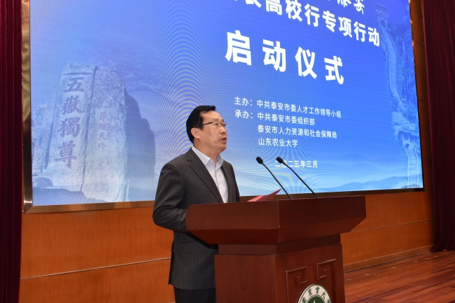 泰安市委常委、組織部部長劉泮英介紹泰安市青年人才政策和專項行動總體安排,市委常委、秘書長張穎出席,副市長馬保文主持啟動儀式。學校有關部門主要負責同志和部分應屆畢業生代表參加活動。