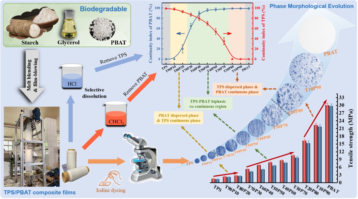 塑料由于質輕價廉和性能優異等優點一直是包裝行業的關鍵材料之一,傳統石油基塑料由于其難以降解性和回收處理不到位等原因帶來了嚴重的環境問題,近年來可持續性、可工業化和可降解性正在成為一次性塑料制品領域的重要考慮因素。聚己二酸-對苯二甲酸丁二醇酯(PBAT)是一種市售的生物降解聚合物,具有類似于低密度聚乙烯(LDPE)的高柔韌性和力學性能,但其較高的市場價格限制了大規模的推廣應用。從商業角度來看,將PBAT與低成本的天然高分子聚合物(如熱塑性淀粉(TPS))共混是制備生物降解材料的實用途徑。然而,疏水性PBAT和親水性TPS之間經常發生不混溶和相分離,這極大地影響復合材料的力學性能,因此TPS/PBAT共混體系的相組成和界面相互作用引起了科學界的廣泛關注。