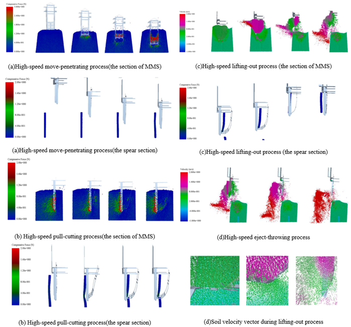 針對(duì)蘆筍脆嫩多汁、易斷易損傷的特點(diǎn),以及土中作業(yè)過(guò)程中的一些參數(shù)難以有效測(cè)量的難點(diǎn),該研究創(chuàng)新設(shè)計(jì)了剛?cè)狁詈侠心┒藞?zhí)行器(PCEE),通過(guò)前行入土、拉切、出土、拋射4個(gè)子過(guò)程實(shí)現(xiàn)高效、低損傷收獲,整個(gè)采收過(guò)程筍芽由土壤包裹損傷概率極小。通過(guò)建立PCEE-土壤-筍模型,利用雙向耦合MBD-DEM (Multi-Body Dynamics and Discrete Element Method,多體動(dòng)力學(xué)與離散單元法)分析采收過(guò)程,明確了高速采收過(guò)程中末端執(zhí)行器的構(gòu)型變化以及部件-土-筍之間的互作耦合機(jī)理和粒子的運(yùn)動(dòng)規(guī)律,對(duì)末端執(zhí)行器的結(jié)構(gòu)設(shè)計(jì)、作業(yè)參數(shù)優(yōu)化、采收性能提升具有重要的理論依據(jù)。