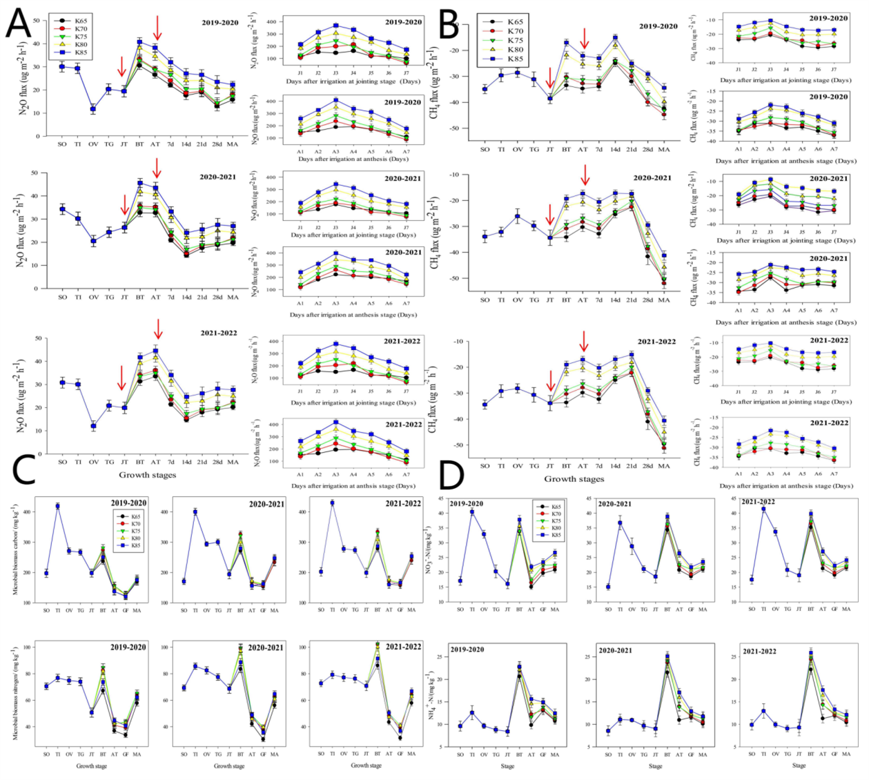 過量灌溉和降水會增加土壤有機物厭氧分解產生CH4排放和土壤反硝化產生的N2O排放,同時伴隨著CO2排放。該研究發現,增加灌溉量顯著提高了冬小麥生長季土壤N2O的排放,K85處理灌溉產生的較高土壤濕度促進土壤硝化作用,誘發大量的N2O排放。此外,K85處理下的土壤無機氮含量高,為土壤硝化和反硝化提供了反應基質,增加麥田土壤的N2O排放。同時,相關分析的結果表明,N2O通量與土壤水分、NO3--N和NH4+-N含量呈正相關。結果表明,適當的灌溉水平(K75)可通過降低無機氮含量來減少土壤N2O排放。