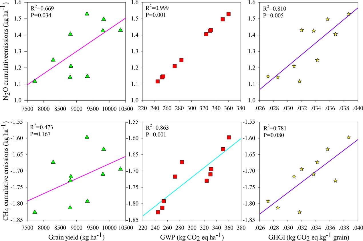 圖2. 糧食產量、全球變暖潛能值(GWP)和溫室氣體強度(GHGI)與溫室氣體排放之間的關系