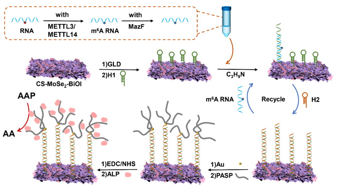 研究表明,N6-甲基腺嘌呤(m6A)的表達與干細胞自我更新、晝夜節(jié)律、發(fā)育缺陷、肥胖、突觸信號和癌癥有關(guān)。因此,m6A的定量檢測在生物學和化學生物學領(lǐng)域具有重要意義。由于m6A的甲基惰性,共價識別法很難實現(xiàn)對m6A的特異性檢測;抗原抗體免疫法是目前應(yīng)用最廣泛的方法,但抗體價格昂貴,保存條件苛刻,批次間差異較大。因此,本工作擬采用相關(guān)蛋白識別法實現(xiàn)m6A的特異性檢測。基于此,該研究旨在開發(fā)一種操作簡便,靈敏度高,無抗體的光電化學生物傳感器用以同時檢測甲基化RNA、METTL3/METTL14蛋白和MazF蛋白。