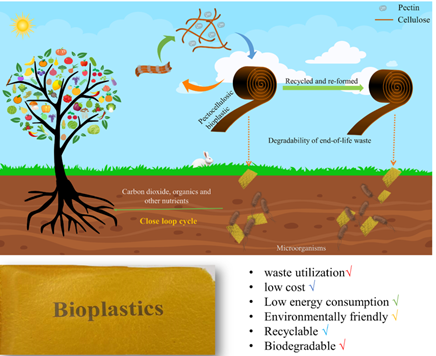 圖1. 果膠纖維素生物塑料的制備、循環(huán)利用和和性能的示意圖