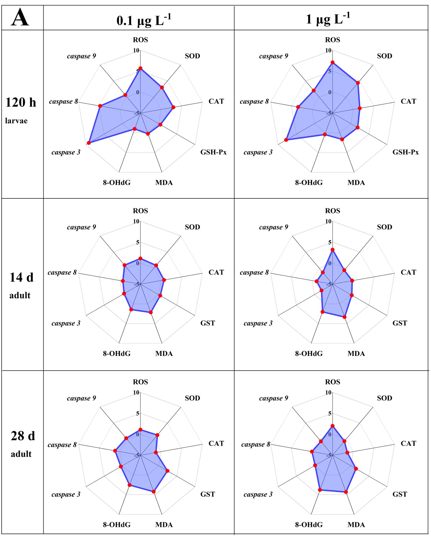 通過計算綜合生物標志物響應指數得出,caspase 3基因和脂質過氧化產物丙二醛可分別作為雙氟磺草胺對斑馬魚幼魚和成魚影響的早期預警指標。雙氟磺草胺的暴露濃度越高,其對斑馬魚幼魚和成魚的毒性越大。暴露時間越久,其對成魚的毒性越高。研究發現了雙氟磺草胺對斑馬魚幼魚和成魚的毒性不同,在未來研究雙氟磺草胺對斑馬魚的毒性時,需要對不同生命階段(幼魚和成魚)進行研究。