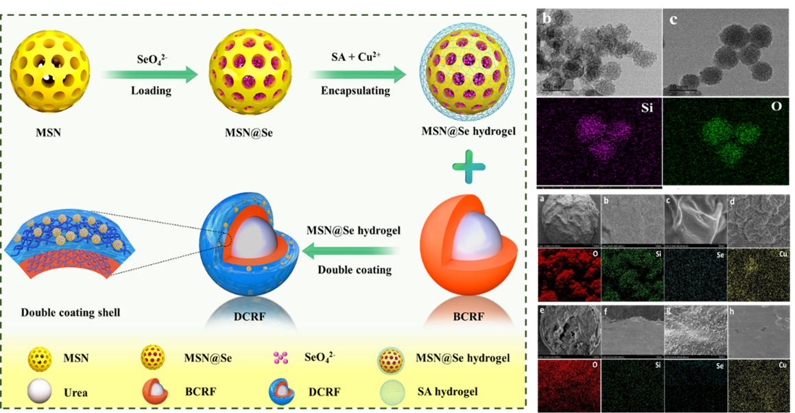 針對上述問題,楊越超教授團隊制備了一種多功能雙層生物基包膜控釋肥,該肥料同時具備緩釋氮、硒和銅元素的能力。該肥料為以尿素作為肥料的核心,生物基聚氨酯作為內涂層,藻酸鈉和銅離子形成水凝膠作為外涂層制備而來。此外,負載硒酸鈉的介孔二氧化硅納米顆粒被用于修飾海藻酸鈉水凝膠(MSN@Se水凝膠)。