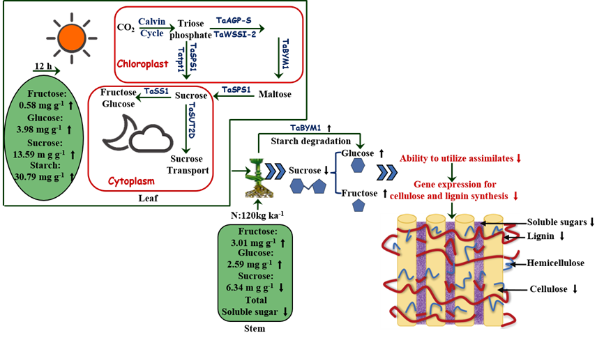 葉片進行光合作用合成淀粉,多余的淀粉被降解并輸出,這增加了葉片的可溶性糖含量,其中的蔗糖被向外轉運。莖稈利用葉片轉運的蔗糖進行生物合成。氮肥增加了葉片可溶性糖含量,即增強了葉片生產同化物的能力。