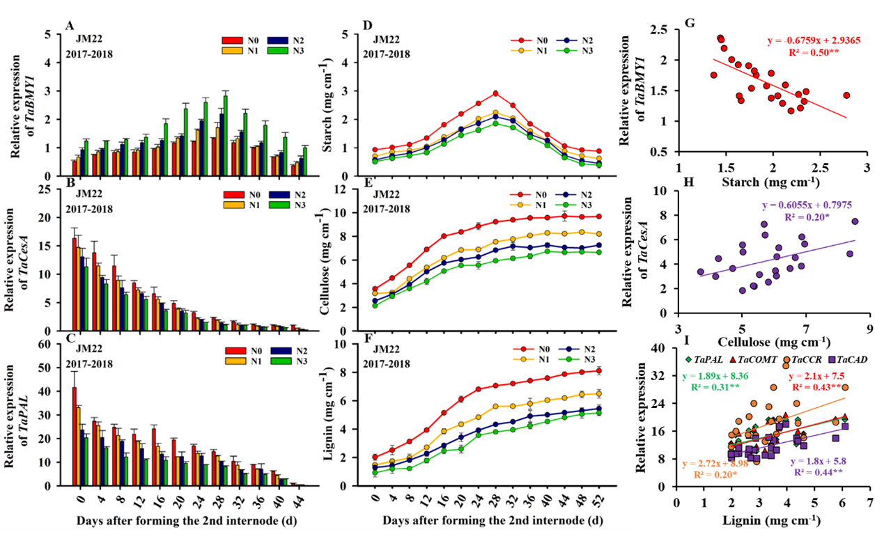 圖1. 施氮量對莖稈基部第二節間碳水化合物含量、基因表達的影響