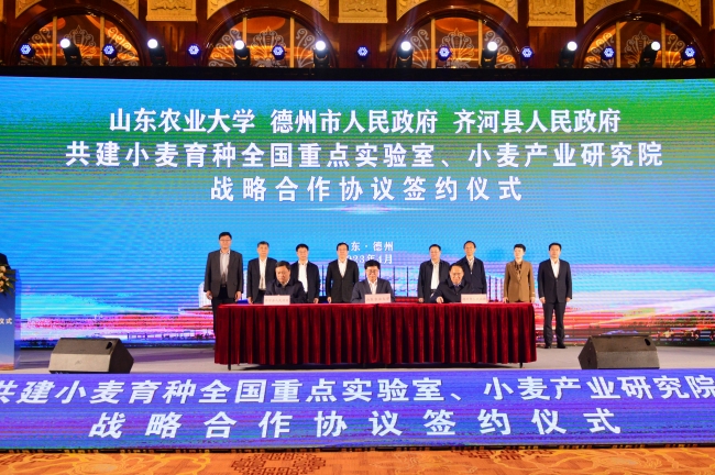 4月17日,山東農業(yè)大學與德州市人民政府、齊河縣人民政府共建小麥育種全國重點實驗室、小麥產業(yè)研究院戰(zhàn)略合作協(xié)議簽約儀式在德州舉行。