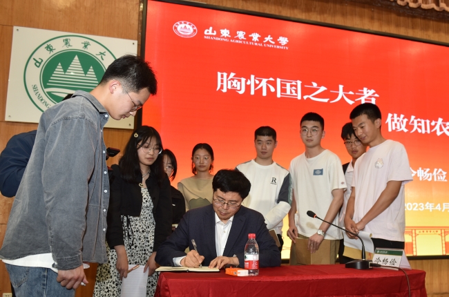課后,同學們紛紛走上講臺,就公費農科生在校學習與就業形勢、學校與德州共建小麥產業研究院對相關專業學生的就業推動等問題,請冷暢儉給予指點。冷暢儉耐心為同學們分析形勢,指點迷津,并親筆為同學們寫下奮斗寄語,勉勵同學們成長為國家期待、學校期許、自我希望的社會主義建設人才。