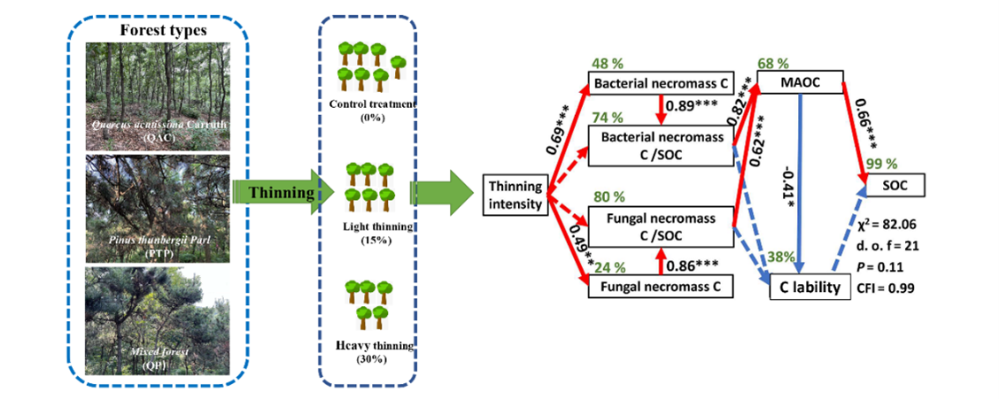 進(jìn)展1:在期刊《Science of the Total Environment》發(fā)表了題為“The effect of thinning intensity on the soil carbon pool mediated by soil microbial communities and necromass carbon in coastal zone protected forests”的研究論文,博士研究生張子胥為第一作者,博士研究生郝茗為共同第一作者,高鵬教授為通訊作者,山東農(nóng)業(yè)大學(xué)為該研究成果的第一完成單位。