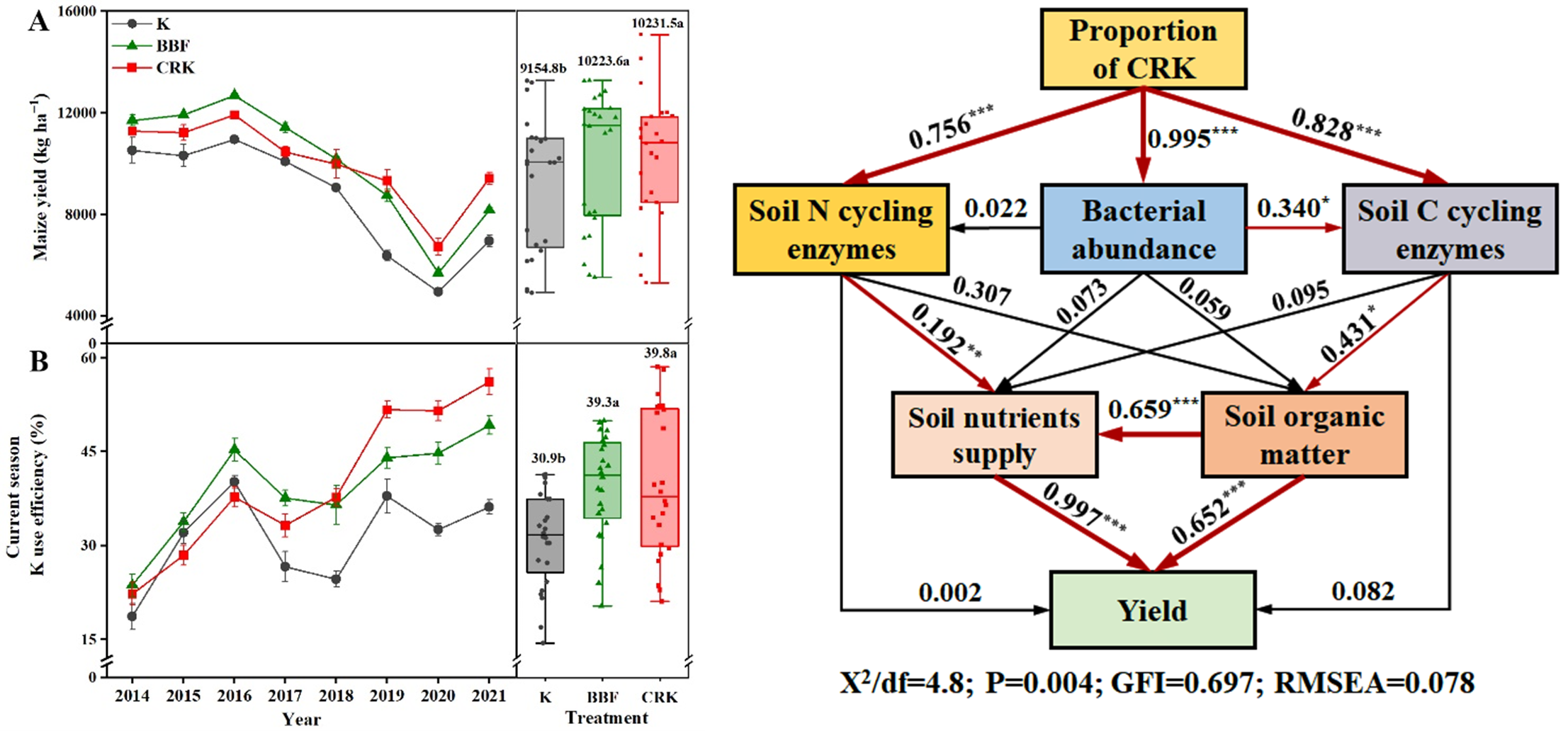 增加施用控釋氯化鉀的百分比顯著提高了與碳和氮循環相關的細菌(Bacillus, Gaiella, and Sphingomonas)的多樣性和豐度;鉀離子緩慢釋放增強了共發生網絡分類群之間的相互作用強度,減少功能冗余;顯著提高了土壤肥力,增強了土壤菌落的組成和功能,解釋了82.8%的細菌菌落變異;直接提高了土壤氮循環酶含量和細菌群落相對豐度,間接提高了土壤養分供應7.1–38.6%,玉米產量提高了11.7–11.8%,鉀肥利用率提高了8.4–13.2百分點。