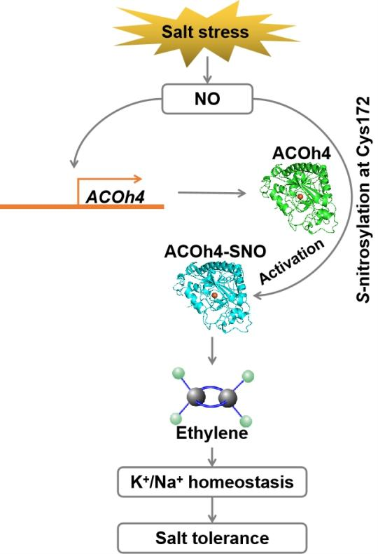 綜上所述,本研究首次闡明了鹽堿脅迫下NO誘導(dǎo)乙烯合成的關(guān)鍵酶(ACOh4)及其調(diào)控機制,并解析了NO和乙烯在調(diào)控番茄鹽堿抗性中的相互作用關(guān)系和分子生理功能。研究成果可為番茄耐鹽堿品種遺傳改良和耐鹽堿化控栽培技術(shù)研發(fā)提供理論依據(jù)。