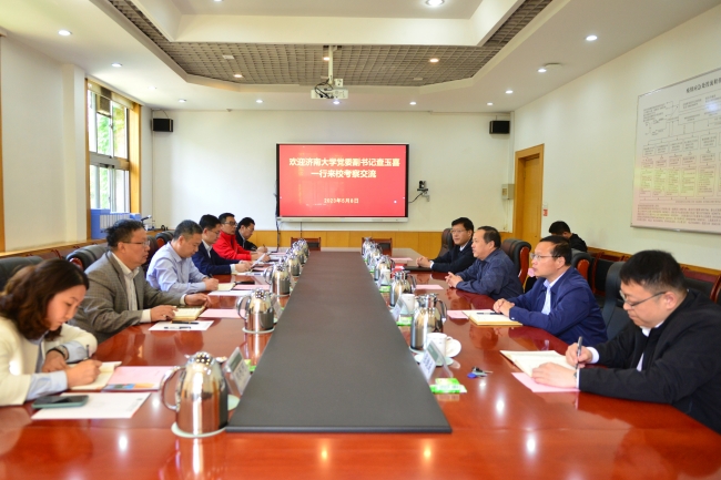 5月8日,濟南大學黨委副書記查玉喜等一行來訪,圍繞干部選任與考核、宣傳思想、統戰及巡察工作等進行考察交流。學校黨委副書記嵇景濤會見客人并座談。