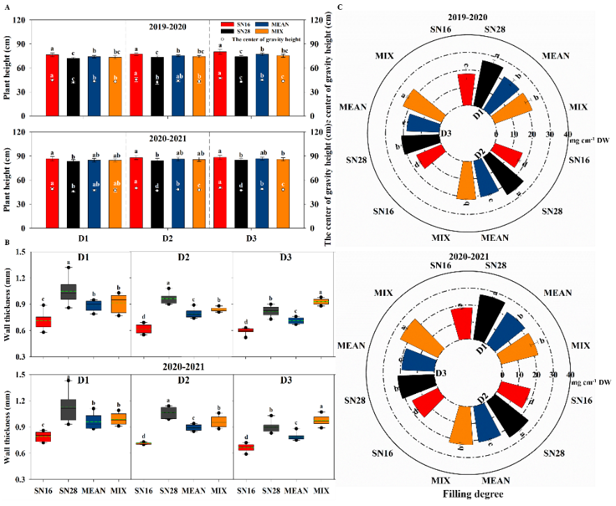 提高種植密度是小麥增產的主要途徑之一。然而,密植群體資源競爭加劇,莖稈發育質量變差,倒伏風險增加。混作可以利用品種的生態多樣性解決密植小麥群體倒伏性與產量的矛盾。然而,混作增加密植小麥莖稈抗倒伏性是由于品種間物理支撐,還是由于群體光環境優化,莖稈質量改善,導致抗倒伏性能提高,還尚不清楚。該團隊通過設置不同種植密度和種植模式,研究混作對小麥冠層光環境、莖稈抗折力及產量形成的影響,闡明混作提高密植小麥莖稈抗倒伏性和產量的機制。