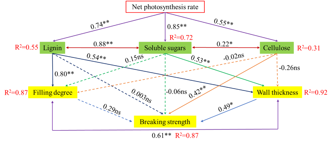 圖3 旗葉凈光合速率、莖稈化學組分和形態特征影響第二節間抗折力的結構方程模型