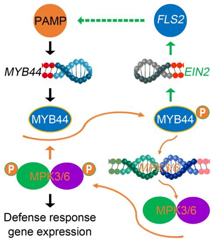 植物在感受到病原菌保守分子模式后,MYB44可以直接結(jié)合MPK3和MPK6基因的啟動(dòng)子區(qū)促進(jìn)其轉(zhuǎn)錄;同時(shí),MPK3和MPK6以功能冗余的方式磷酸化MYB44,進(jìn)一步提高其促進(jìn)MPK3和MPK6轉(zhuǎn)錄的活性,增強(qiáng)MAPK級(jí)聯(lián)反應(yīng),激活植物免疫。此外,研究人員發(fā)現(xiàn)MYB44還可以通過(guò)促進(jìn)乙烯信號(hào)途徑重要調(diào)控基因EIN2的表達(dá)增強(qiáng)植物PTI。該研究闡明了PTI過(guò)程中MAPK級(jí)聯(lián)反應(yīng)調(diào)控新機(jī)制,豐富了植物先天免疫調(diào)控機(jī)理的理論體系,也為植物抗病新途徑的建立提供了科學(xué)依據(jù)。