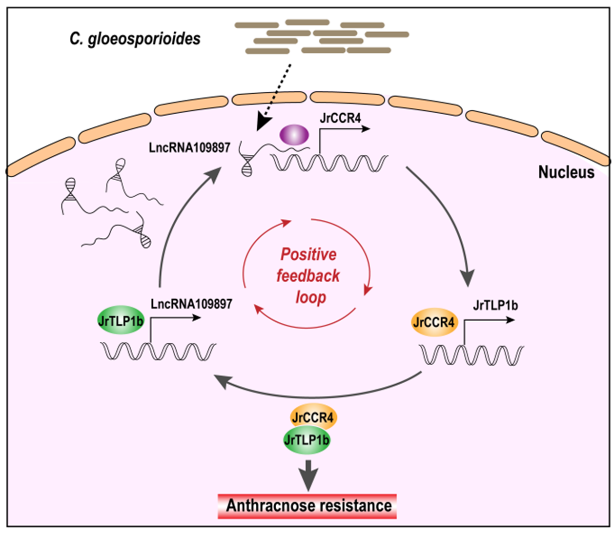 LncRNA 及其靶基因在植物抗病的先天免疫過程中發揮著重要作用。楊克強/房鴻成團隊通過轉錄組分析和 qRT-PCR 篩選到一個與核桃抗炭疽病顯著相關的lncRNA109897 及其靶基因 JrCCR4。團隊以JrCCR4 蛋白作為誘餌,Y2H 篩庫實驗發現JrTLP1b 為JrCCR4 的潛在互作蛋白;Pull down 和BiFC 實驗反向驗證了JrCCR4 與JrTLP1b 的互作關系。利用體外蛋白降解實驗和LUC 實驗證明JrCCR4 不僅可以穩定JrTLP1b 的蛋白活性,還可以激活 JrTLP1b 的轉錄。同時, JrTLP1b 能夠誘導 lncRNA109897 的表達并激活 lncRNA109897 啟動子的轉錄活性。在核桃葉片中的瞬時轉化和對擬南芥的穩定遺傳轉化實驗均證明了lncRNA109897、JrCCR4 和JrTLP1b 可提高轉基因葉片對膠孢炭疽菌的抗性。這些研究結果闡明了 lncRNA109897-JrCCR4-JrTLP1b 以正向反饋環路調控核桃對炭疽病抗性,拓展和深化了核桃對炭疽病抗性的認識,也為核桃抗病聚合育種提供了思路。