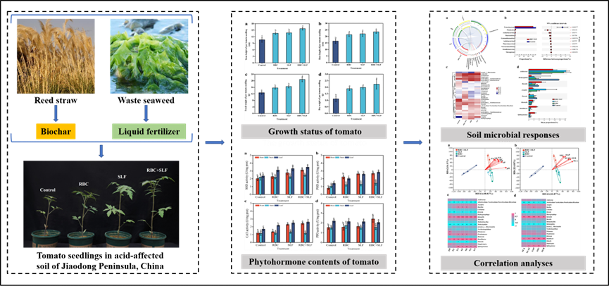 由于化學肥料的長期過量施用,目前全球約30%的耕地面臨不同程度的土壤酸化問題,嚴重影響農業可持續發展。植物保護學院楊龍教授領銜的科研團隊從根際微生物方面解析了海藻液體肥與生物炭聯合改良酸性土壤的作用機制。相關研究成果“Combinations of waste seaweed liquid fertilizer and biochar on tomato (Solanum lycopersicumL.) seedling growth in an acid-affected soil of Jiaodong Peninsula, China”在《Ecotoxicology and Environmental Safety》上發表。