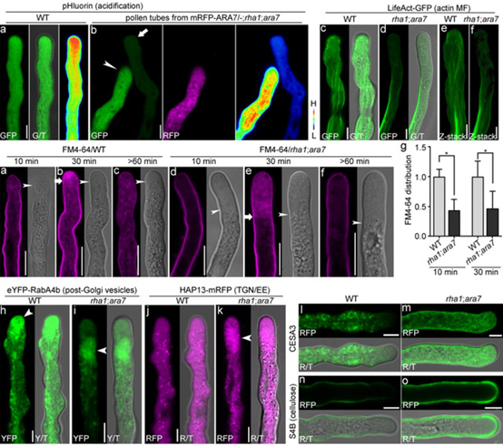 作者通過GUS和Aniline blue標(biāo)記以及花粉管半體內(nèi)(Semi-in-vivo)生長實(shí)驗(yàn),發(fā)現(xiàn)rha1;ara7雙突花粉管無法正常穿過花柱;進(jìn)一步研究發(fā)現(xiàn)Rab5介導(dǎo)的液泡運(yùn)輸途徑被阻斷,導(dǎo)致液泡體積明顯減小,形態(tài)異常;液泡是質(zhì)子儲(chǔ)存的關(guān)鍵細(xì)胞器,通過pHLuorin標(biāo)記胞質(zhì)酸堿度,發(fā)現(xiàn)rha1;ara7花粉管具有更低的pH;胞質(zhì)的pH穩(wěn)態(tài)喪失導(dǎo)致花粉管頂端微絲紊亂且數(shù)量較少,外泌囊泡在花粉管亞頂端聚集,無法迅速與頂端質(zhì)膜融合;FM4-64標(biāo)記的內(nèi)吞速率也明顯降低,表明質(zhì)膜上的膜動(dòng)態(tài)異常。由Rab5基因突變引發(fā)以上多種胞內(nèi)活動(dòng)的缺陷,從而阻礙了花粉管穿過花柱的生長過程。