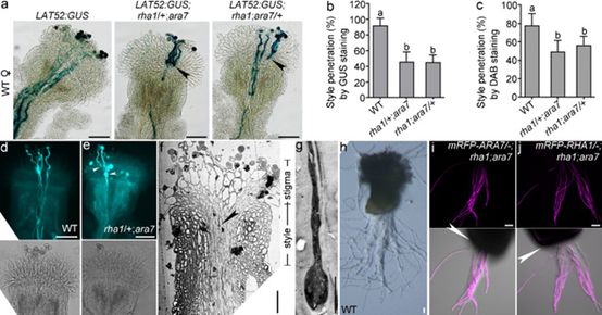圖1. 經(jīng)典Rab5成員RHA1和ARA7功能缺失導(dǎo)致花粉管不能穿過花柱