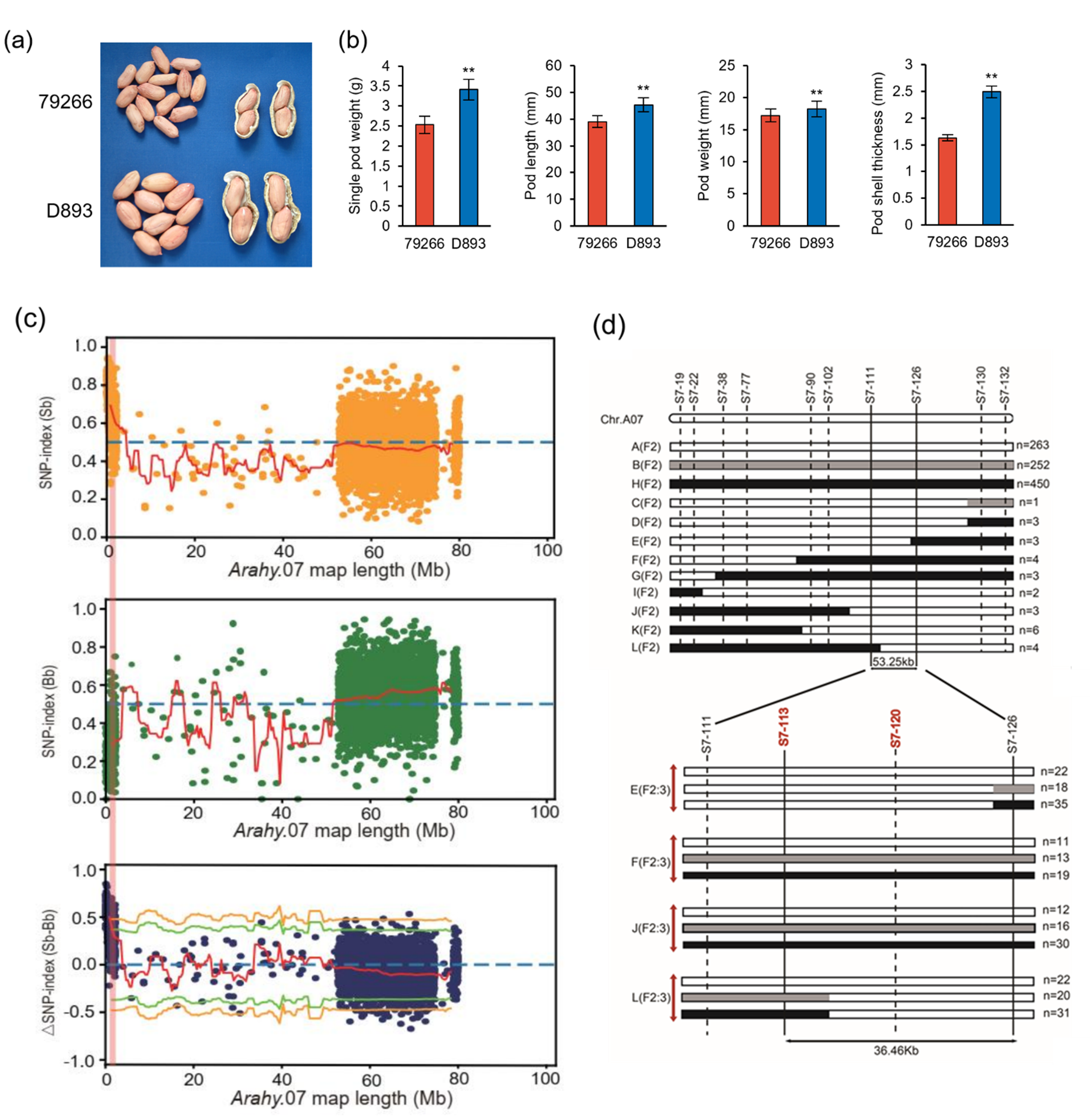 近日,山東農(nóng)業(yè)大學(xué)萬勇善/劉風(fēng)珍團(tuán)隊在Plant Biotechnology Journal在線發(fā)表了題為“Fine mapping of qAHPS07and functional studies of AhRUVBL2controlling pod size in peanut (Arachis hypogaeaL.)”的研究論文。該研究發(fā)現(xiàn)了調(diào)控花生莢果大小的關(guān)鍵基因AhRUVBL2,為解析花生莢果大小的分子調(diào)控機(jī)制提供了科學(xué)依據(jù),也為花生莢果大小遺傳改良提供了分子標(biāo)記。