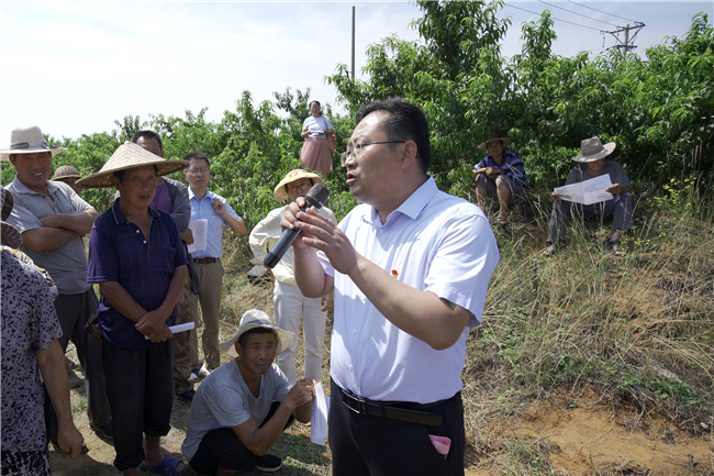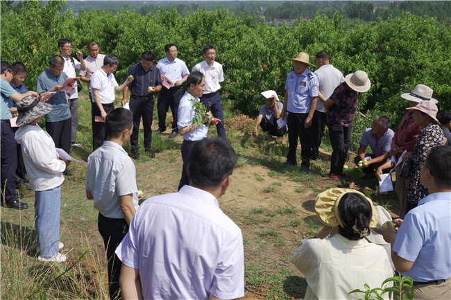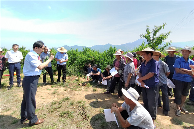 6月21日,驕陽似火。臨沂市蒙陰縣垛莊鎮(zhèn)桃園里,山東農(nóng)業(yè)大學(xué)植物保護(hù)學(xué)院組織相關(guān)專家,給當(dāng)?shù)毓r(nóng)上了一堂“緊急的”桃園病蟲害管理現(xiàn)場(chǎng)技術(shù)指導(dǎo)課,手把手交給果農(nóng)病蟲害防治方法。