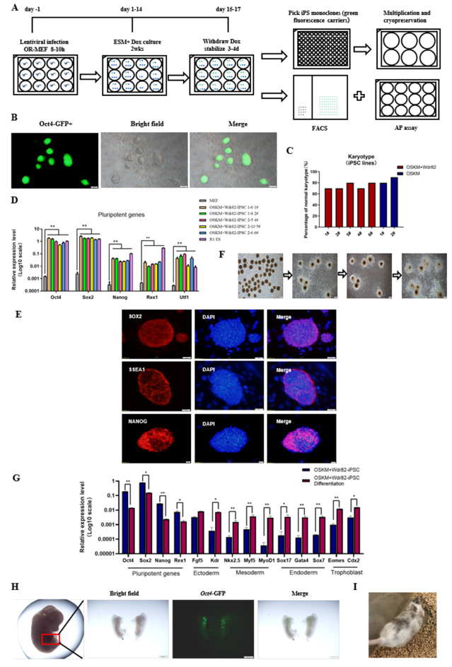 圖1. 體細胞重編程形成的Wdr82+OSKM-iPSC克隆具有干細胞功能,可產生嵌合體小鼠