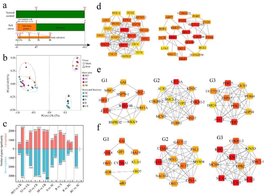 全球每年約有10%的土地面臨鹽漬化威脅,我國鹽漬化土地約15億畝。山東鹽堿地889萬畝,其中,黃河三角洲地區鹽堿地占698萬畝。檉柳(Tamarix chinensis)具有較高的耐鹽堿脅迫能力,是黃河三角洲濱海鹽漬濕地生態系統的重要樹種。由治理鹽堿地適應植物,向選育耐鹽堿植物適應鹽堿地轉變,是挖掘鹽堿地開發利用潛力的戰略舉措。楊克強教授團隊利用PacBio和Hi-C測序技術,從頭組裝了檉柳染色體水平的基因組,對檉柳水培苗鹽脅迫處理和恢復階段的根、莖組織進行了轉錄組分析。測序組裝的檉柳基因組大小為1.32 Gb,scaffold N50達110 Mb,99.53%的序列定位到12條染色體上,基因組完整度達97.4%,基因組QV達39.03;基因組包含24,211 (91.62%)個可注釋的編碼基因。進化分析顯示,檉柳在早第三紀(Palaeogene)的3,988 ± 1,295 萬年前發生了全基因組復制(WGD)事件。WGD和串聯重復(TD)基因與檉柳對鹽脅迫的適應性相關,HAT和LIMYB基因家族成員顯著擴張(圖1)。鹽脅迫和恢復階段根和莖組織的轉錄組分析表明,在鹽脅迫條件下,根和莖呈現不同的基因表達譜。Hub基因分析顯示,WRKY33/40、MPK3/4和XBAT31基因在鹽脅迫早期響應中起關鍵作用,WRKY40、ZAT10、AHK4、IRX9和CESA4/8基因在脅迫后期和恢復過程中參與檉柳鹽脅迫響應,編碼III類過氧化物酶的PER7/27/57/73基因和編碼DNA復制執照因子的MCM3/4/5/7基因在鹽脅迫和恢復階段保持上調或下調表達(圖2)。研究組裝了高質量的檉柳基因組,揭示了檉柳基因組進化特征,挖掘了檉柳耐鹽關鍵基因,為檉柳抗鹽遺傳改良和抗鹽基因利用提供了基礎。