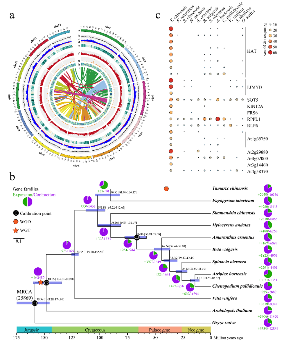 圖1 檉柳基因組特征及進化分析