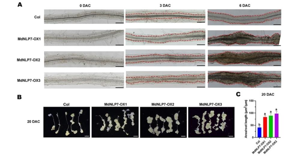 在本研究中,將蘋果MdNLP7轉錄因子在擬南芥中異位表達,發現MdNLP7蛋白可以調控以根為外植體的植物再生;進一步的研究結果表明,MdNLP7介導了中柱鞘細胞分裂的起始。在愈傷組織形成的過程中,MdNLP7可以上調生長素合成和轉運相關基因的表達,并通過影響生長素的分布來實現對根外植體愈傷形成過程的調控,進而調控硝酸鹽介導的根外植體再生。