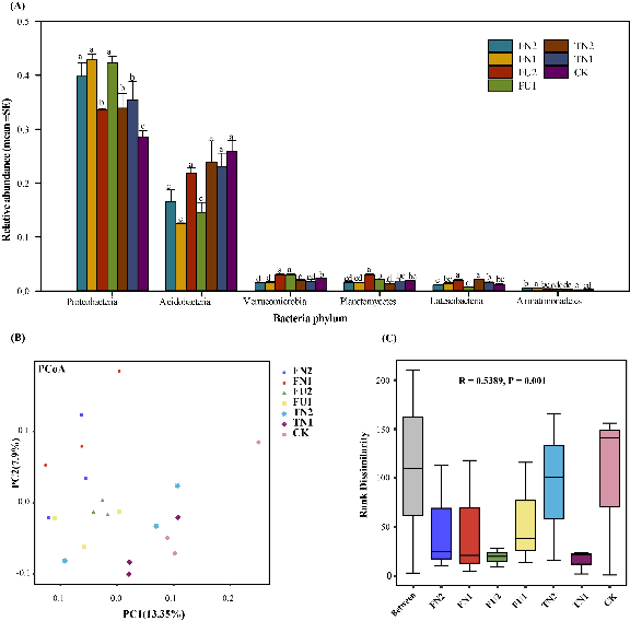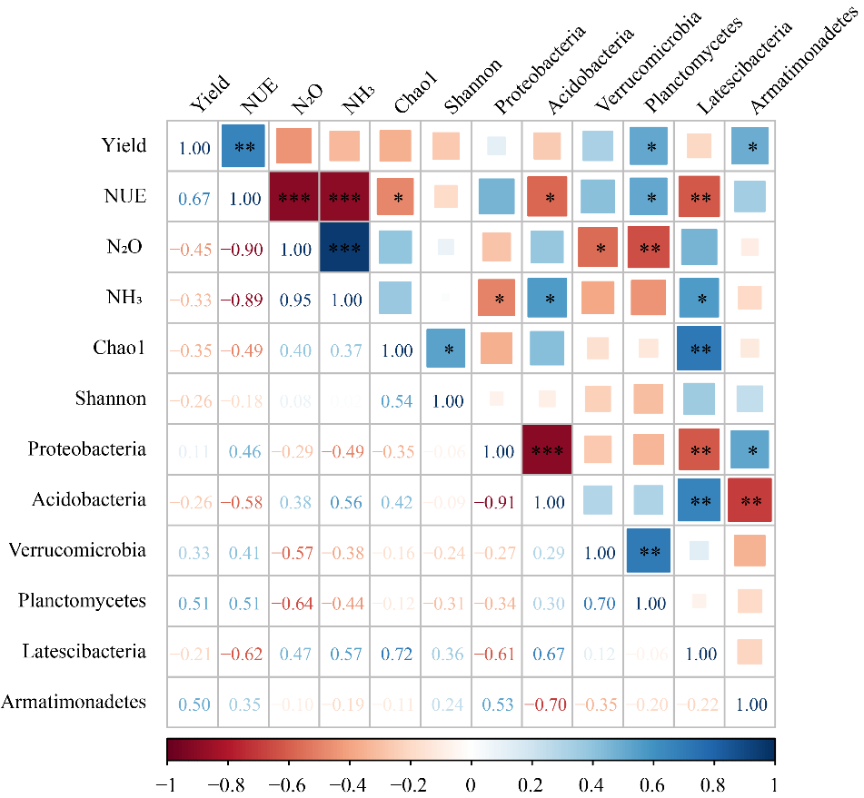 該研究表明,施氮方式、氮肥類型和施氮量均對N2O排放通量和NH3揮發(fā)造成顯著影響(圖2)。微噴水肥一體化顯著降低了夏玉米季N2O排放通量和NH3揮發(fā)量。與傳統(tǒng)施肥方法相比,微噴水肥一體化施用尿素處理的總NH3揮發(fā)量和累積N2O排放量分別顯著降低了19.0%和34.2%。與施用尿素處理相比,施用UAN進一步降低了N2O累積排放量和NH3揮發(fā)量。同樣,NH3揮發(fā)和累積N2O排放通量也受施氮量的顯著影響。此外,施氮影響細菌群落的多樣性和豐富度。在傳統(tǒng)施肥方法下,施氮量對細菌多樣性和豐富度沒有顯著影響。然而,在微噴水肥一體化條件下,細菌α多樣性指數(shù)對施氮量的響應隨氮肥類型的不同而不同。施氮量對細菌群落α多樣性的影響也因施氮方式的不同而不同,微噴水肥一體化減氮處理更利于保持細菌群落多樣性和豐富度。與此同時,施氮增加了變形菌門的相對豐度,降低了酸桿菌門的相對豐富度。與尿素相比,UAN處理顯著增加了土壤中疣微菌門和浮霉菌門的相對豐度。與傳統(tǒng)施肥處理相比,在微噴水肥一體化施用尿素增加了變形菌門的相對豐度,降低了酸桿菌門的相對豐度(圖2)。相關性分析進一步表明,細菌群落多樣性以及門水平差異微生物等與夏玉米產(chǎn)量和氣態(tài)氮損失均具有相關性(圖3)。總之,微噴水肥一體化施用UAN可以提高夏玉米產(chǎn)量,節(jié)省氮肥,是一種有效的農(nóng)業(yè)可持續(xù)的氮肥管理措施。