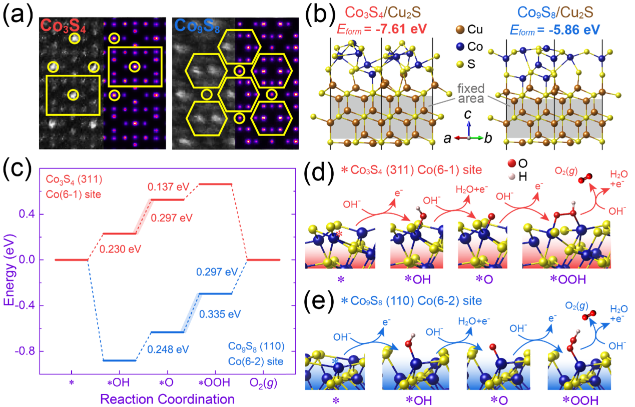 論文提出了一種光熱協(xié)同界面相變促進(jìn)高效電催化水分解的新策略,創(chuàng)新性地融合了界面相變和光熱效應(yīng),開發(fā)了一種多重異質(zhì)Co9S8/Co3S4/Cu2S納米顆粒作為析氧反應(yīng)(OER)電催化材料,其中Co3S4在Co9S8和Cu2S之間的界面上生長(zhǎng)。理論計(jì)算表明,將Co9S8和Cu2S整合在一起會(huì)觸發(fā)Co9S8的界面相變,從而導(dǎo)致界面Co3S4層的形成,這是因?yàn)镃o3S4/Cu2S(-7.61 eV)的形成能比Co9S8/Cu2S(-5.76 eV)低。這種相變不僅降低了OER的能壘(從0.335 eV降低到0.297 eV),還引發(fā)了界面電荷的重新分布,增加了載流子密度(從7.76×1014cm-3增加到2.09×1015cm-3),并創(chuàng)造了更多的活性位點(diǎn)。
