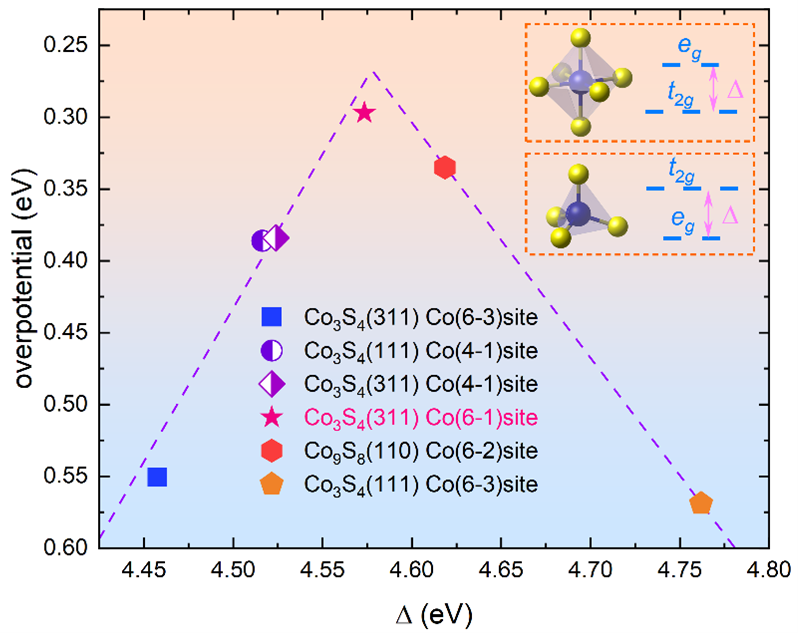 圖.1 理論計(jì)算揭示了界面相變的機(jī)制,以及Co3S4(311)表面Co(6-1)位點(diǎn)是最佳活性位點(diǎn)