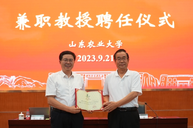 大會(huì)期間,山東農(nóng)業(yè)大學(xué)兼職教授聘任儀式同時(shí)舉行,高旺盛教授受聘為我校兼職教授,并為我校師生做題為《建設(shè)中國特色農(nóng)業(yè)強(qiáng)國理論框架與戰(zhàn)略路徑》的報(bào)告,冷暢儉出席活動(dòng)并為其頒發(fā)聘書,王勇主持活動(dòng)。