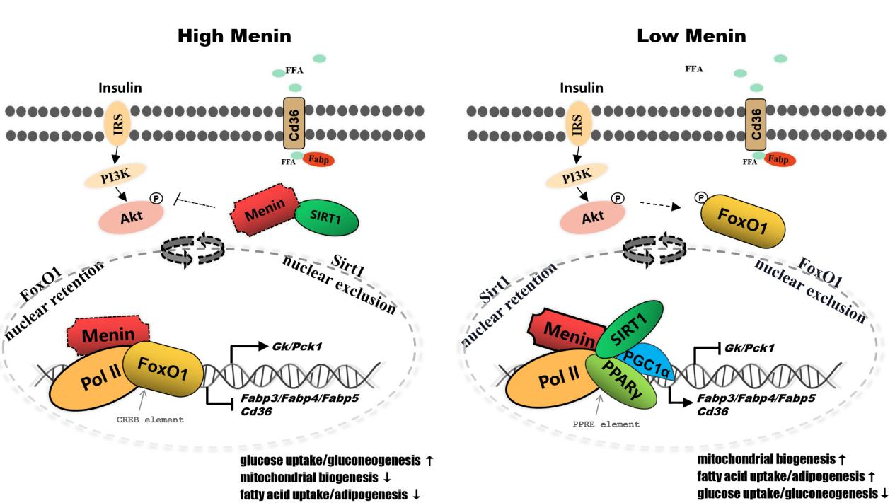 Menin是由Men1基因編碼的支架蛋白,以“抑癌基因”的角色募集豐富的轉錄因子(互作)參與基因的表觀遺傳修飾,通過激活或抑制基因的表達而廣泛調控細胞的生命活動。Menin的功能突變或缺失導致多發性內分泌腺瘤病Ⅰ型(MEN1),對于機體的代謝具有重要的調控功能。例如,肝組織特異性Menin缺失或肝細胞特異性Menin缺失都易發(非酒精性)脂肪肝,同時伴隨胰島素抵抗和Ⅱ型糖尿病表型。這表明Menin與肝臟代謝穩態之間的潛在聯系。該研究發現Menin可以調控肝細胞的代謝穩態,“運籌帷幄”肝臟糖代謝與脂代謝之間的局勢,扮演“謀局者”的角色。肝細胞Menin既可以通過與細胞能量傳感器SIRT1、PPARγ相互作用來靶向脂質轉運蛋白Fabp3/4/5以及Cd36的表達,從而調控脂質的吸收與代謝;又可以與FoxO1相互作用來靶向Gk、Pck的表達,從而調控葡萄糖的吸收與代謝。不僅如此,Menin還可以募集和部署這些互作蛋白在胞質/胞核中的分布,通過協調肝細胞對葡萄糖和脂肪酸的攝取進而調控細胞的代謝穩態。