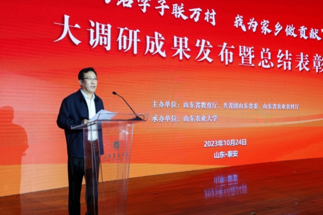 徐劍波在致辭中介紹了學校開展“萬名學子聯萬村,我為家鄉做貢獻”大調研活動基本情況和取得成果,感謝省教育廳、團省委、省農業農村廳、建設銀行、農業銀行、山東廣播電視臺等單位對大調研的大力支持。他說,本次大調研實現了對山東省內行政村的全覆蓋,擴大了學校的影響力,強化了師生愛農情懷,提升了興農本領,完成了階段性任務,開啟了學校服務全面推進鄉村振興、打造“齊魯樣板”,服務農業強國建設的新局面。徐劍波表示,下一步,山東農業大學將深入總結經驗、發揚優勢,持續加大服務力度,按照產業分類組建專家工作群為鄉村發展解難題,深化學校人才培養模式改革,建立聯系服務基地、搭建科技服務平臺,逐步構建全省鄉村發展的動態數據庫,為加快農業強省建設提供全面、詳細的數據支撐,進一步推動大調研走深走實,努力將其打造成為我省省屬高校服務鄉村振興的靚麗品牌。希望與各參與單位攜起手來,在與國家行動同頻共振中,在落實全面推進鄉村振興、加快建設農業強國的火熱實踐中,共同努力交出一份滿意的答卷。
