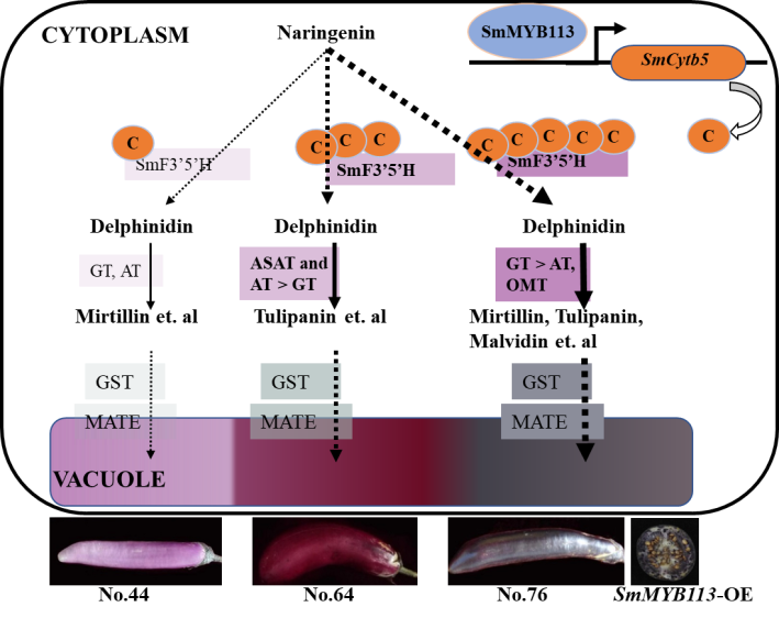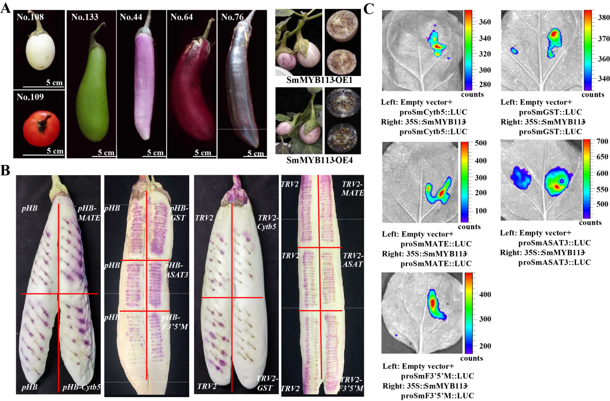 該研究首先采用三種分析策略對從6個茄子品種果皮中獲得的RNA-seq數據進行了分析,共篩選到27個可能與茄子不同顏色形成相關的差異表達基因。以兩個SmMYB113茄子過表達株系和野生型植株為試材,對果實快速生長期的果皮和果肉進行RNA-Seq分析,共鎖定32個新基因可能受到SmMYB113的調控。對上述發現的新基因進行Venn分析,發現5個被注釋為SmCytb5、SmGST、SmMATE、SmASAT3和SmF3’5’M的基因既可能與不同顏色形成相關,又可能受到SmMYB113的誘導。果皮瞬時表達實驗發現,這5個基因對茄子皮中花青素的積累起著重要作用。酵母單雜交、電泳遷移率變動分析和雙熒光素酶分析表明,SmMYB113蛋白可以直接結合這五個基因啟動子上的順式作用元件,并激活基因表達。綜上,該研究提出了茄子不同果皮顏色形成的調控模型。研究結果增強了我們對茄子果皮顏色形成的理解,并有助于類黃酮、花青素生物合成和分子育種的后續研究。