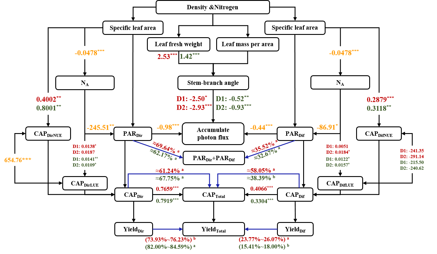 圖2. 葉形,密度,氮肥差異對冠層光能利用的影響