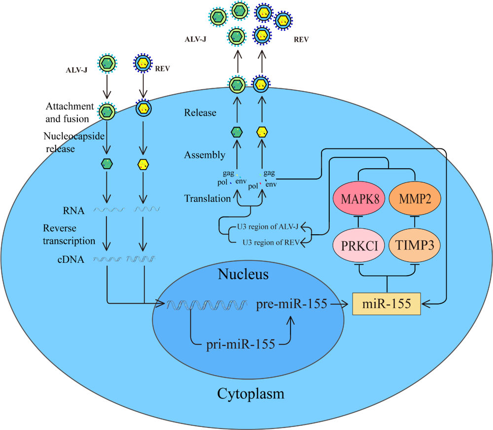 論文揭示了禽白血病病毒J亞群與禽網狀內皮組織增殖病病毒協同促進了一種關鍵的miRNA(miR-155)的表達,這種miRNA能夠直接調控PRCKI-MAPK8和TIMP3-MMP2雙通路,通過影響兩種病毒復制的關鍵區域(LTR區)促進禽白血病病毒J亞群與禽網狀內皮組織增殖病病毒協同復制。