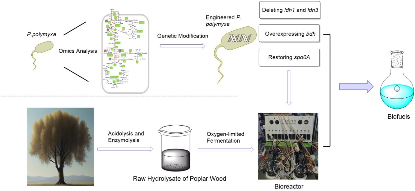 圖1. 構建多粘類芽孢桿菌工程菌及利用楊木水解原液發酵生產2,3-丁二醇的技術流程