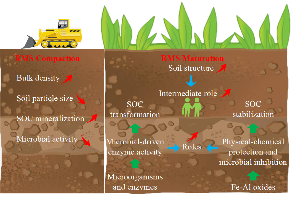 土壤有機碳的積累對復墾土壤的發育及其生態系統功能的恢復至關重要。為了優化復墾管理實踐,研究旨在從系統的視角探究影響復墾土壤有機碳及其組分恢復的關鍵因素和內在機理。以中國東部煤礦區的采煤塌陷區為研究對象,將復墾耕地與周圍未塌陷耕地進行比較。結果表明,復墾過程中壓實破壞土壤結構產生的鏈式反應導致土壤容重增加、土壤顆粒細化、有機碳礦化增強以及微生物活動減弱。適應性更強的細菌群落對活性有機碳組分的利用在鏈式反應過程中發揮關鍵作用。土壤結構在復墾土壤生態系統中的中介作用突出,特別是對于碳循環過程。復墾土壤對土壤結構變化的響應更加敏感,微生物和酶對于土壤結構變化的響應成為關鍵。在復墾土壤碳循環過程中,微生物驅動的酶活性對于土壤結構的響應在有機碳轉化過程中至關重要,同時鐵鋁氧化物介導的物理化學保護和微生物抑制對有機碳穩定的作用更為突出。