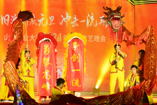 晚會以“辭舊迎新慶元旦 沖擊一流再啟程”為主題,由在校師生、離退休教職工、附校學生共同演繹。晚會在山東農(nóng)業(yè)大學民樂團帶來的《盛世歡歌》中拉開序幕,離退休教師的歌伴舞《親吻祖國》、附校小朋友帶來的舞蹈《甜甜的糖球會》與山農(nóng)學子的《龍獅踏春》、《節(jié)日歡歌》營造出濃厚的節(jié)日氛圍。