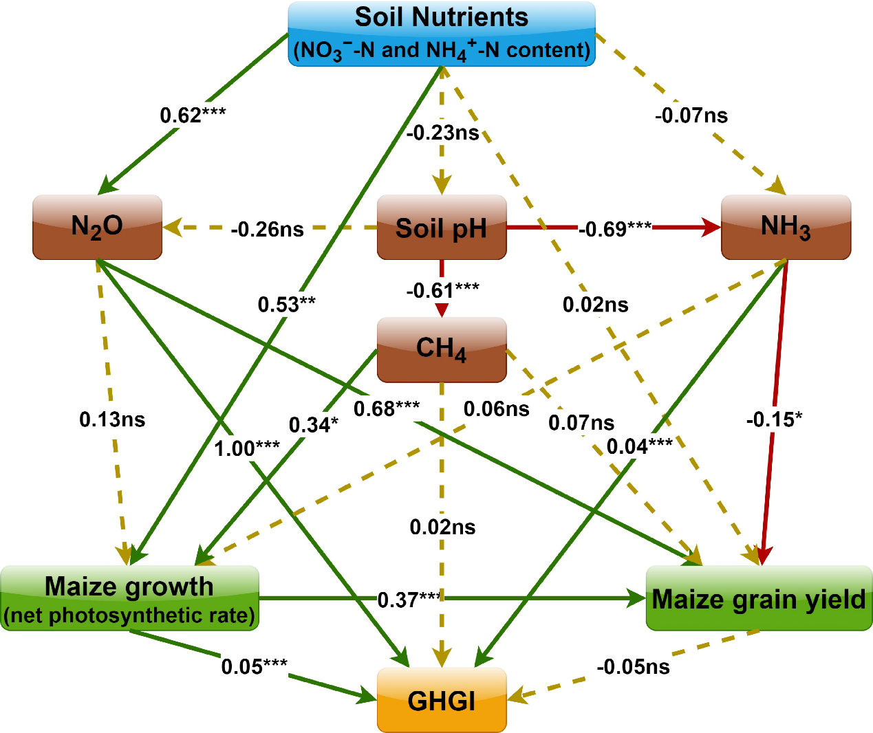 圖2. 結構方程模型(SEM)顯示了土壤養分、NH3、N2O、CH4、土壤pH、玉米生長發育和籽粒產量對GHGI的直接和間接影響