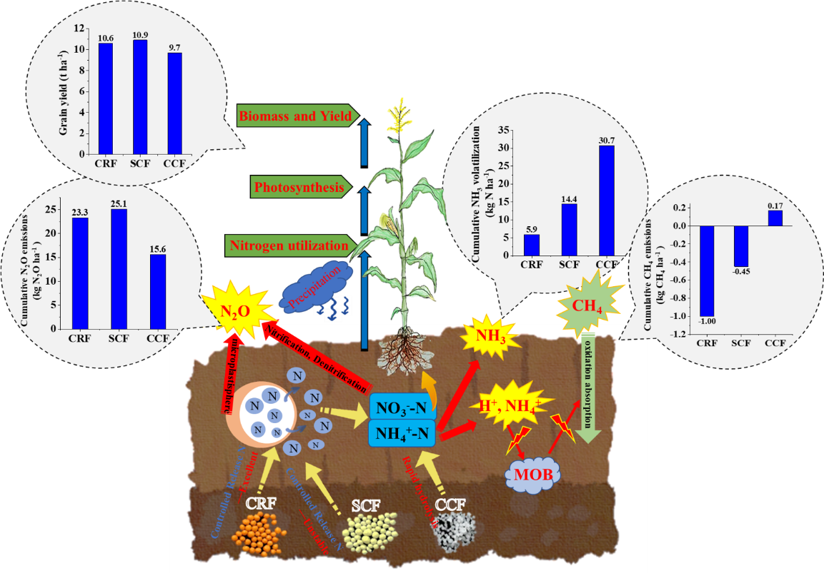控釋尿素(CRU)因其卓越的氮素控制釋放效果而在大田作物生產中廣泛應用。然而,在肥料長期定位條件下,CRU對夏玉米生長,尤其是對溫室氣體排放的影響,尚未得到充分評估。為深入研究這一問題,該團隊開展了為期10年的肥料長期定位試驗,通過設置不同氮素類型,旨在揭示CRU對玉米產量形成、氮素利用效率、氨揮發以及溫室氣體排放的調控機制。