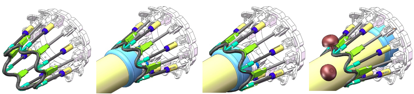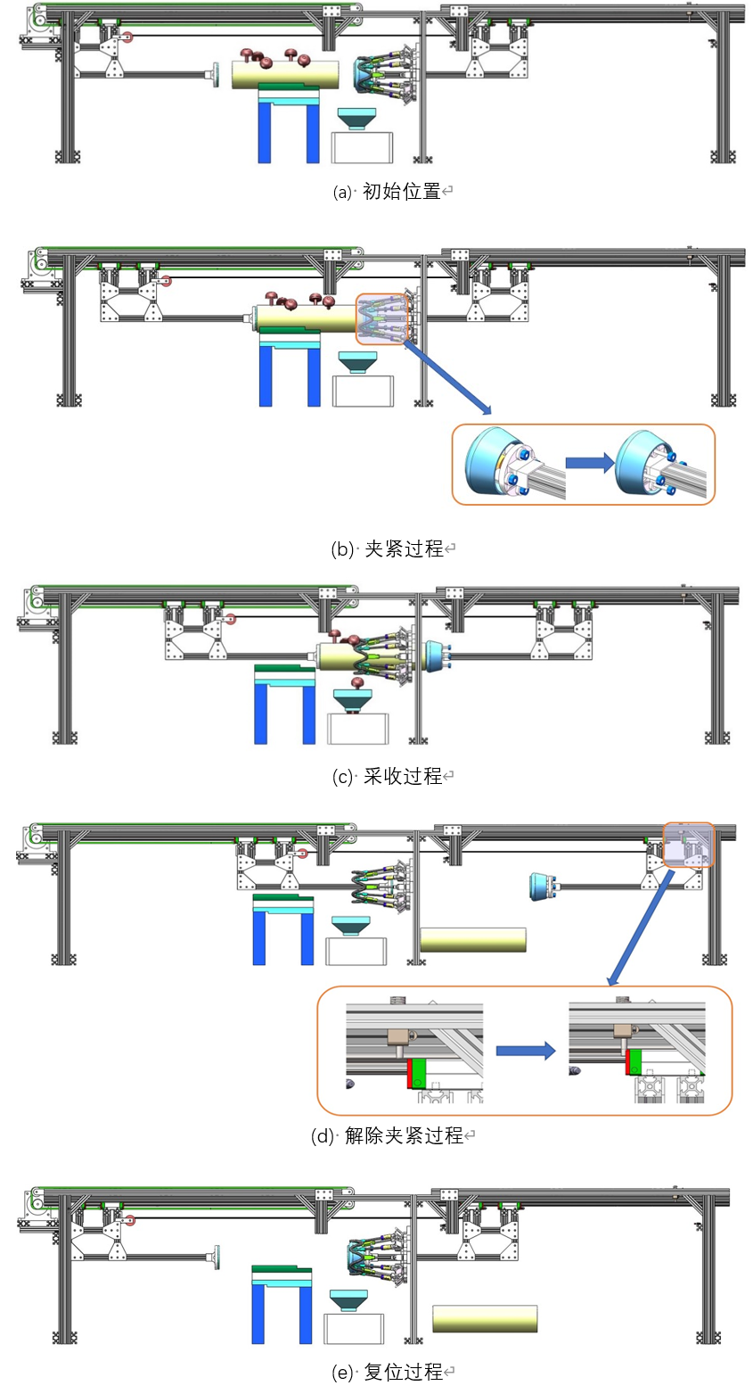 針對香菇生長密集、采摘易損傷、高速采摘等需求,該研究首創了香菇機械化采摘新模式,并創新設計了一種新型的香菇采收末端執行器(圖1),實現低損傷、高效采摘。通過采摘過程動態過程(圖2)的力學分析和有限元分析,明確了采收過程中末端執行器部件-香菇-菌棒的分離機理,優化了末端執行器的結構設計和作業參數,對提升采摘性能具有重要的理論指導作用。