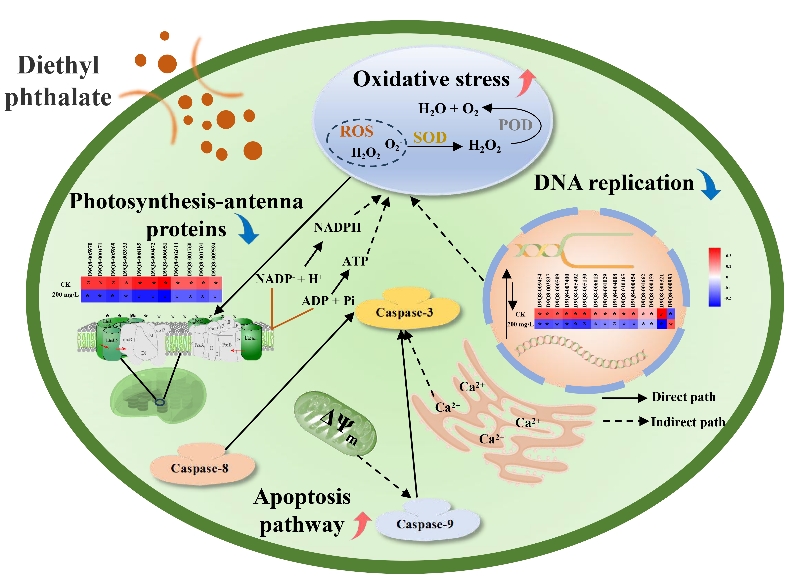 研究結果表明,DEP能夠抑制藻細胞的生長和光合色素含量,誘導氧化應激,進而導致藻細胞膜完整性喪失和細胞形態改變。DEP通過降低藻細胞MMP,上調Caspase-9和Caspase-3活性,最終通過線粒體途徑誘導細胞凋亡。此外,藻類細胞中的Caspase-8和Ca2+在污染物脅迫后活性升高,表明DEP可能通過外在死亡受體途徑和內質網途徑誘導藻類細胞凋亡。轉錄組分析表明DEP主要通過干擾光合作用-天線蛋白通路(photosynthesis–antenna proteins)、萜類物質合成(terpenoid backbone biosynthesis) 和DNA復制(DNA replication)過程來抑制普通小球藻的生長。綜上,本研究為全面評估DEP對普通小球藻的生態風險提供了新的科學認知,對推動水環境生態保護和污染控制具有重要意義。