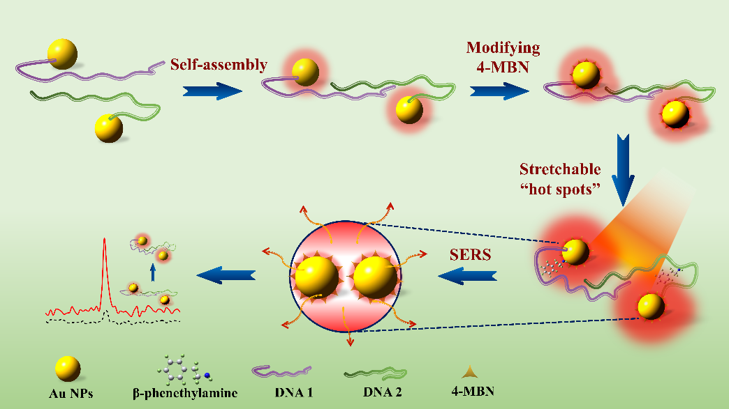 圖1. 適配體構(gòu)象介導(dǎo)金二聚體自組裝用于β-苯乙胺的SERS檢測(cè)示意圖